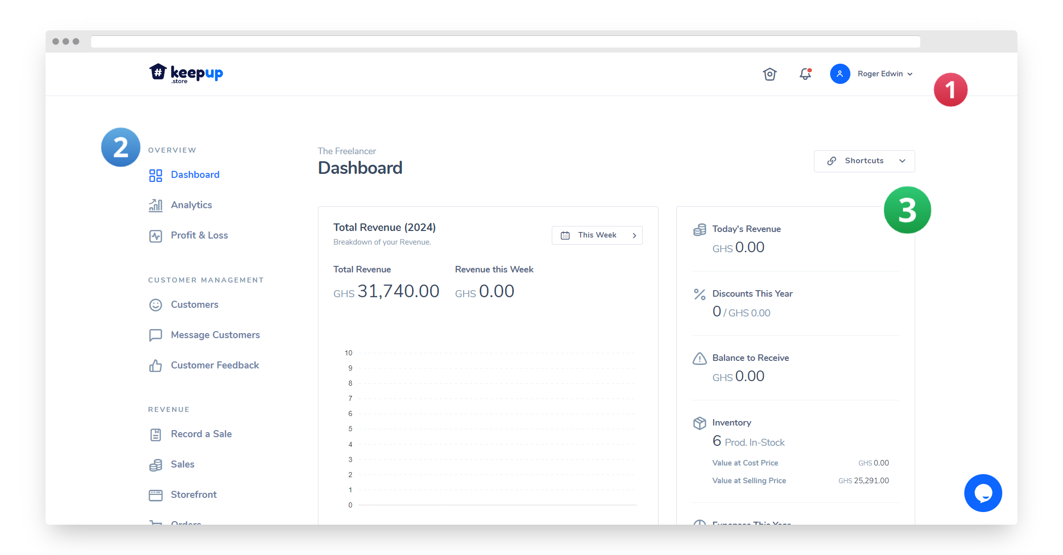 * **Access Features:** The side menu on the left allows you to access all the features Keepup Store has to offer.