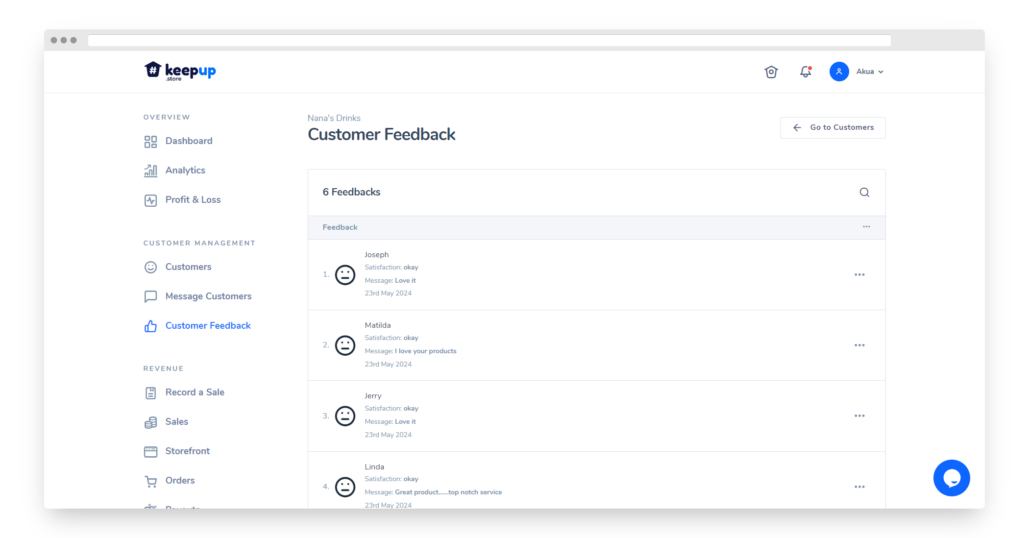 1. **Click on "Customers" from the side menu and click on "Customer Feedback". This will take you to the Customer Feedback page.**&#x20;